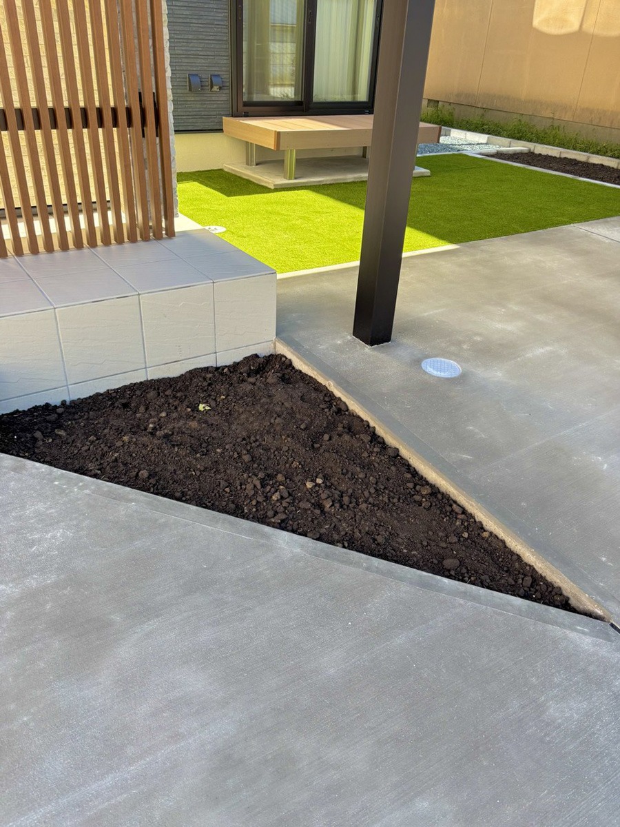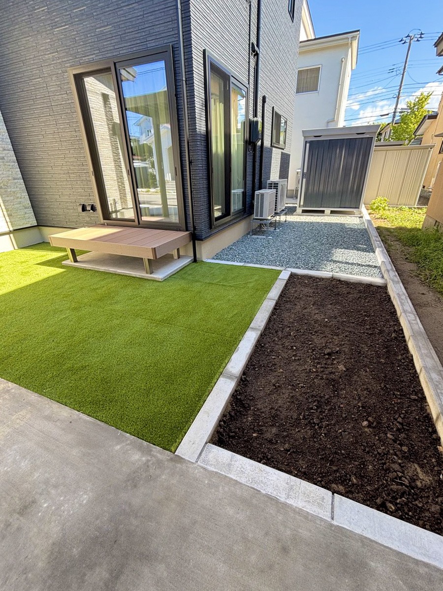 秋田市 O様邸 カーポート、車庫土間、人工芝、ウッドデッキ、物置、植栽スペース